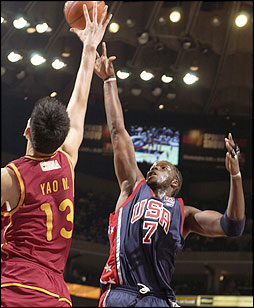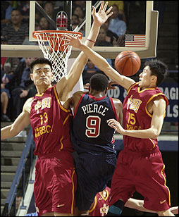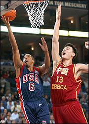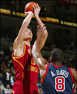 On the down side, he was susceptible to getting stripped several times when he put the ball on the floor. I think the quickness of the USA team probably surprised him. He also missed a dunk, which the crowd responded to. But the thing I liked about Yao that I didn’t expect was the expression after missing that dunk. He realized he goofed, and smiled. No big deal. “I can laugh at myself,” he seemed to be saying. Earlier in the game, he hit a tough jump shot and showed a Tiger-esque fist pump. He also gave his teammates high-fives on almost every great play. This is no faceless giant, no prima donna. I predict he will quickly show a personality that will endear him with team members, fans and the media. |