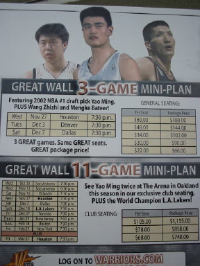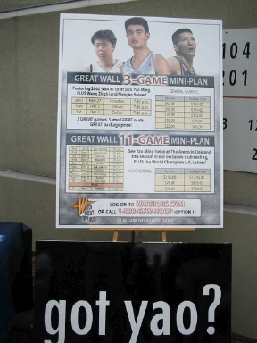 One of my main impressions is that Yao does not try to hog the ball, nor demand it. He also doesn’t force dumb shots and try to do too much. He plays under control. Although he’s their best player, you can tell he lives by the team concept. I must admit that disappointed me since I flew out to Oakland to see a highlight reel of a game, but the logical part of me understands that approach ultimately wins championships. And that nature will come in handy when playing with Stevie Franchise and Cat Mobley. But the Houston fans will want more, like I did tonight. One of the plays you probably didn’t see on the news was a sweet head fake he gave on a jump shot near the free throw line, resulting in Ben Wallace flying into him, with both crashing to the floor. The crowd responded loudly to the arms and legs that flailed before hitting the floor with a thud. That kind of Larry Bird-like savvy will put Yao on the free throw line many times this year. And he’ll make those free throws. His form on those shots, and most of his jump shots, are a thing of beauty. Almost perfect rotation with nice swishes. It’s unusual to see such form from a big man, especially after witnessing too many Cato bricks over the past few years. |